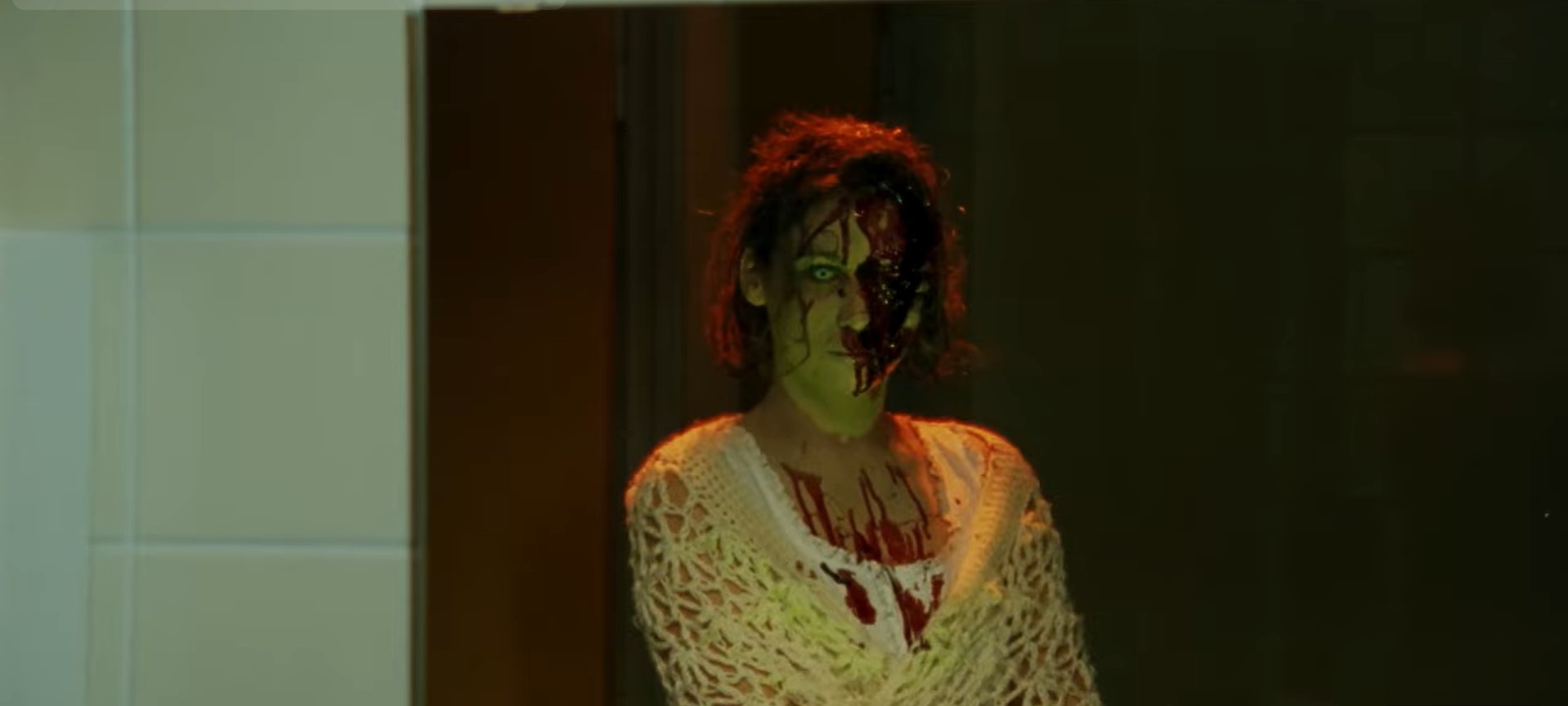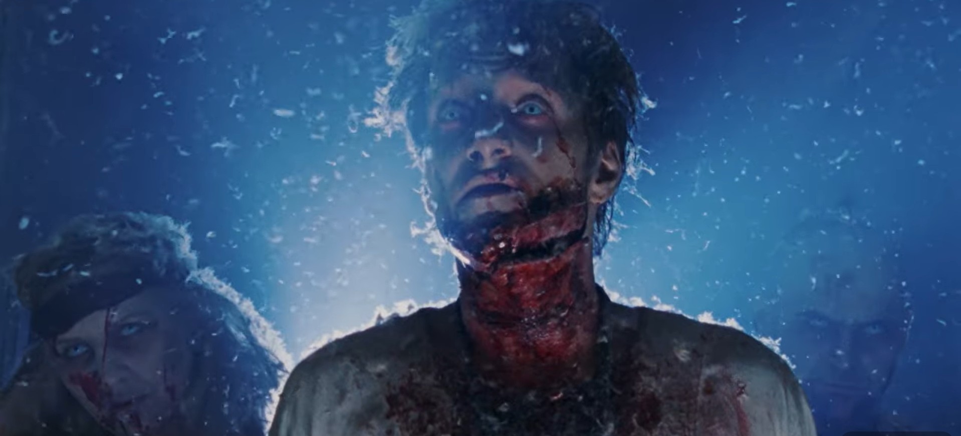 Natacza Boon, the English actress behind acting in a parallel Ittanbach production “Beyond the Limits” the same year, stars the adult version of Rebecca Verlaine bewildered by the truth be told after learning of her amnesia and once ghastly ghosts begin to talk to her through television sets. Boon does a good job selling the initial fear and then transitioning into acceptance that was she’s visioning is real, real enough to absolute slaughter anyone in a spray of blood spatter when crossing its path. While Boon is English born, the rest of the cast also includes more Ittenbach entourage American with Daryl Jackson (“Beyond the Limits,” “Dard Divorce”) playing Rebecca’s secret-holding lover David and the German native James Matthews-Pyecka (“Beyond the Limits,” “Legend of Hell”) as the initial inspector on the Verlaine massacre returning to the cold case to assist Rebecca’s need to explore her forgotten history. Through the differing nationalities and styles each performer brings to the this splatter film, their dynamics have synergy having worked in tandem with another and despite their difference languages there is no language barrier to be broken as the film is written and shot in English with Mattehws-Pyecka, and the rest of the living principal cast of Rebecca’s adopted parents in Uncle Don and Aunt Barbara (Donald Stewart and Alexandra Thom-Heinrich), communicating with clear pronunciation. German musician and actor, Bela B., a stage name as the punk rock drummer and vocalist for Die Ärzte, has an equally primary role that opposites Boon in portraying her murdered father’s vengeful spirit. Real name Dirk Albert Felsenheimer, he’s depicted mostly in gruesome face-wounded makeup and ghostly milky white eyes that haunt his onscreen daughter Rebecca from beyond the grave and manifest only in the building where he died (much like that BBC show “Ghosts” but Ittenbach did it first). Felsenhaimer’s unique facial contours make for good prosthetic balefulness and frightful fear being the head ghost who doesn’t necessarily go for the throat right away like the others.