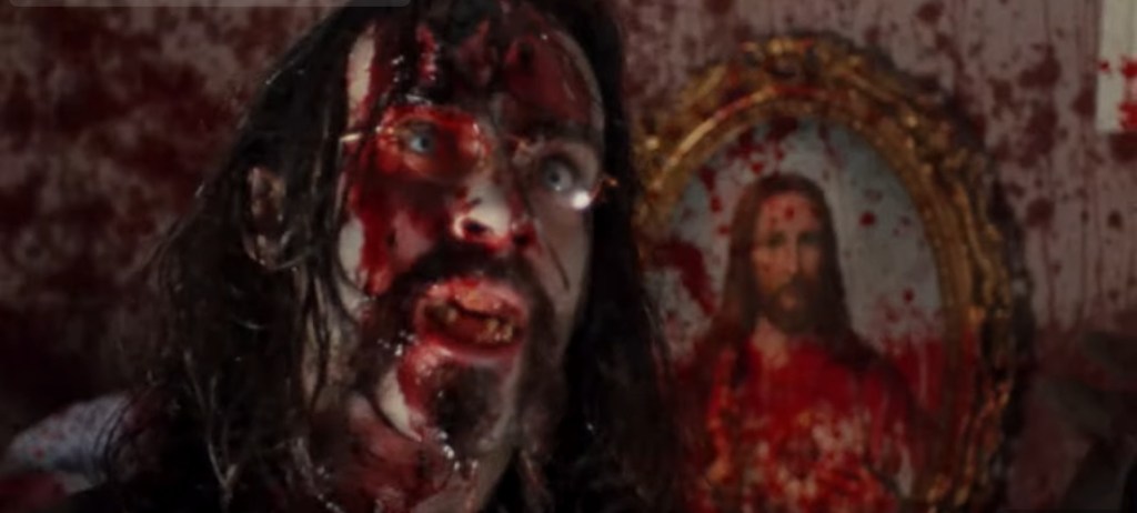 “Garden of Love” is a cut-and-dry revenge film from the other side with not just a touch of but a full five-finger death punch of gory exaggerated explosion from Olaf Ittenbach. Gabe Verlaine, his daughter, and his commune of bohemians have their harmony violently stolen from them, creating disharmony in the afterlife. Their unrest is stretched outward into the corporeal world as love and peace is replaced with hate and spite in stark contrast. Yet, and this where the little things become lost to the ridiculously entertaining blood splatter, the reason why their group returns to take vengeance is far from being elucidated. Apparently, Gabe is also sitting on a fortune for his…well…we don’t know. He plays the guitar but there are hints of him being a talented musician, but it’s never explained on why he’s sitting on a nest egg that’s the overarching theme of greed ingrained into the “Garden of Love” story. What’s not ambiguous is the practical effects done with complete care in all fields from Olaf Ittenbach and Tommy Opatz (“BloodRayne,” “Black Death”) special makeup and prosthetic effects to the flawless editing work of Eckart Zeraway to piece the components of a sequence together for seamless quality and relayed purpose, such as pulling out comedy from the slapstick splatter of bodies literally being torn apart. Let’s not forget to mention Holger Fleig’s cinematography as he captures eldritch supernaturality to emphasize the undead commune in an European, specifically Italian, way with a glowingly colorful, backlit haze that’s denotes an otherworldly tone, a tinged musing of Michael Müller’s work in “Premutos, compared to the modernist and contemporary arrangements of a clean and minimalism look with the living done without specialized lighting.