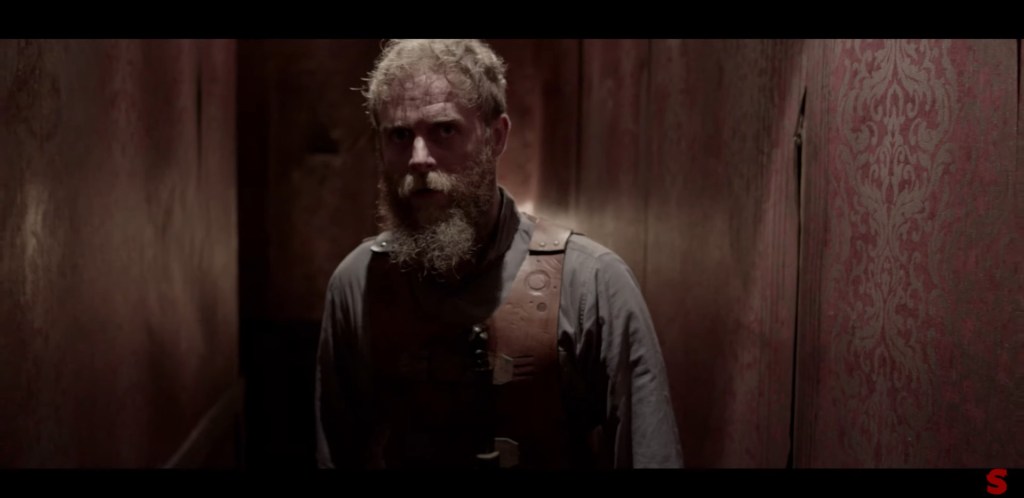 A person would have to be out of their right mind to agree to every single warning flag about this situational premise.  In fact, Isaac, a character recovering from head trauma that resulted in short term memory loss, would seem to be the ideal candidate.  Irish actor Jonathan French plays the scruffy-looking Isaac and with little backstory to go upon first meet, we’re stuck with French’s face splayed stuck lost and confused for most of the duration that’s a simultaneous ride for the audience who jump right into first talks of caretaking agreement without living, experience, and visualizing much of anything else before then but in the first instance meeting the man with a radical beard, Isaac is obviously not a long-shore fisherman and is also seems to be mindfully altogether and rational, if not very acute, about with what’s happening around him.   French doesn’t play a brain damaged invalid; instead, Isaac goes reluctantly with the flow as a rather poorly written gawk who thinks giving into another man’s intention of being strapped into a S&M vest is okay and left to rightfully care for a more true-to-form mental case on any level. The further the introduction is into Isaac’s odd assignment, the more we wonder why the hell isn’t he about facing and running across that barrier lake like Christ himself. That other man is Moe Barrett (Ben Caplan, “Band of Brothers“) who also strolls onto the scene in the beginnings of conversing with Isaac as if old pals and though Caplan is very good at Barrett’s normal and persuasive spiels without a hint of abhorrent creepiness behavior, Isaac’s so gullible to a fault that it kills that need for deliverance from protagonists to try their best to avoid an unfavorable situation when they see one. Leila Sykes fills out the main trio as Olga, the on-and-off catatonic teenage niece of Barrett. Again, something’s missing from the character development much in the same way as Isaac. Olga’s just living, if you can call it that, out of her absent parents’ house. Each one of these characters feels abstract, much like the narrative’s story and structure, to offer only incremental oddities one grain at a time to be not too invested in whatever else that might distract from “Caveat’s” mystery.