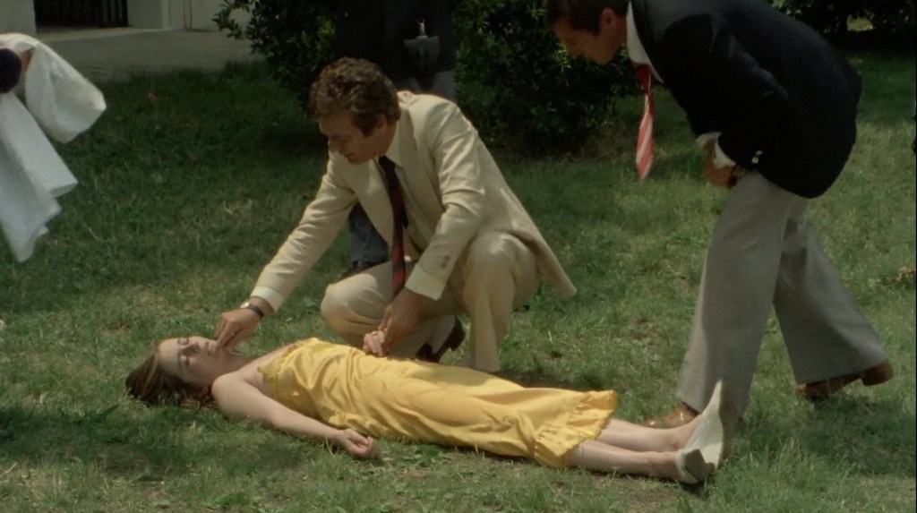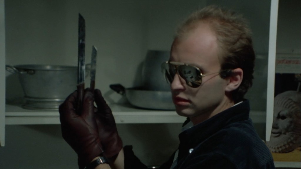 As noted in the previous paragraph, “Gore in Venice” is less giallo than one would expect despite an alternate title denoting the film as such in Italy as “Giallo a Venezia.” Does the killer have gloved hands? Yes. Is Landi’s film stylish enough to pass criteria? Absolutely. Does “Gore in Venice” live up to the eponymous title? Blood flows freely. Yet, why doesn’t “Gore in Venice” feel like a traditional giallo? One of the more clinching reasons is the mystery dissolves roughly halfway into the story by exposing the unmasked, unconcealed killer, trailing off from that unsolved perplexity of who the killer might be at the conclusion. However, one could argue that though the killer is revealed, the question of why all the carnage still remains, leaving the giallo more or less intact. Violent tropes aside, Landi’s film abundantly saturates itself into carnal exploits that linger on-and-on more than necessary to get the point across. These scenes of masturbation, public exhibition, and raging erotic zigzag along a blurry, indistinct line of pornography, coming (and coming!) away from the intended murder-mystery subgenre with more skin and slaughter. That’s not the say “Gore in Venice” fails to live up to the moniker as the kills are as grisly as implicitly promised with a large blade to the vaginal cavity, one poor soul gas drenched and lit up like a bonfire, and a one gal having the naked legs cut out right from under her complete with an extreme closeup of the sawing pellicle perfection. Whether because of Mario Landi’s direction or Aldo Siro’s script, the explicit eroticism eats way too far into the story that, in turn, ultimately betrays any kind character development aside from the tragic perversive arc of Fabio and Flavia. Inspector De Pol often skirts around much of the action being only an investigator continuously trapped in the accounts of other people’s tales of debauchery and always one step late to the crime scene party that baffles his keen scrutinizing eye. I’m not one to deprecate graphic sexual content, especially in works that display actual fondling and masturbation in their art, but “Gore in Venice” mildly entertains as a low-end giallo albeit a spectacularly vivid and vehement blood show in front of the unique waterways of Venice.