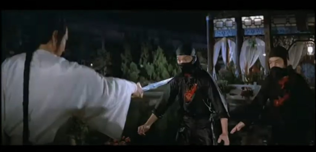 Kung Fu films, especially in the 1970s through well into the 1990s, are a dime a dozen so what makes Chin-Ku Lu ‘s “The Lady Assassin” different from the rest?  One area to note is fight and stunt choreography that smooths the edges around the other contemporaries slower, less theatrical, routines with vigorous and diverse long sequences containing large quantities of combatants.  Usually, most fight sequences are limited to 1-on-1, 2-on-2, and maybe 3-on-3 or 3 or 4-on1 at most, but hordes of swords, staffs, and topographical anomalous landscapes, constructed on a stage of course, are seamlessly dynamic and meritoriously fast paced and thrilling, produced by the stunt work team of Yak Yuen, Kin-Kwan Poon, and Yung Chung.  The other area to note, and one that goes hand-in-hand with the stunt choreography in order for it to work, is Shao Kuang Liu’s editing, taking footage and just going to town with a series of cut and tapes and still coherently fashioning a continuous fight and flight, complete with pulley wires, despite its rapid strikes that might have some accelerated motion of the film.  What’s inherently captivating for “The Lady Assassin” can also be a tiring visual as the fights flare up brief plot points in between, the fights can feel a bit long in the tooth come the third act; however, the final showdown, a last ditch effort between the last of the Han rebels versus the 14th Print and his crazy-faced, hired gun Japanese martial artist levels up the violence that halves fighters horizontal and vertical.  The story’s an effort to keep up with as the continuous double crossing and changes of heart nearly blend together and too many assumed interpretations toward the fate of characters off screen can work the thinker double time, compounding the ambiguous clarifications profoundly.