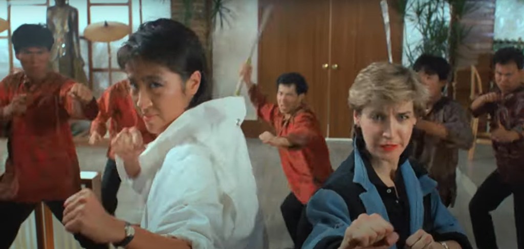If you’re ever looking for a celebrity roots film, a launching pad feature of success, “Yes, Madam!” has that inner circle, star-studded power and deliverance that not only showcases the beginnings of two presently well-known action and martial art film women but also joins the East with the West in a singular chop-socky fracas. Oscar winner Michelle Yeoh (“Crouching Tiger, Hidden Dragon,” “Everything Everywhere All at Once”), credited as Michelle Khan, and black belt martial arts competitor and World Champion Cynthia Rothrock (“China O’Brien,” “Tiger Claws”) explode to the thousandth degree on screen as apex inspectors forced to work together to take down crime boss Mr. Tin (James Tien, “Fist of Fury”). They’re fast, they’re ferocious, they’re incredibly talented in what could be considered their debut principal performances, especially Rothrock in her first feature film in which she doesn’t speak an ounce of either of the native Hong Kong’s Cantonese or Mandarin dialects. Yeoh and Rothrock are top dog heroines in a yard full of marginal, blundering thieves caught in the middle of a grander operation. Under incognito with pain reliever aliases are actor-producer John Sham (“Winners & Sinners”) as Strepsil, Hoi Mang (“Zu: Warriors from the Magic Mountain”) as Aspirin, and Hark Tsui (“Working Class”) as Panadol and though they act like, and sort of resemble, the Three Stooges, the three thieves and counterfeiters embody a mutual brotherhood with background history and a all-for-one, one-for-all attitude as their minor caper turns into a full collapse of their con game. Characters and performances are all over the board between the various groupings in the melee but does weirdly gel together in an artificial way toward a poignant culmination collision of what’s just and unjust that destroys, and unites, friendships and bonds. “Yes, Madam” rounds out the cast with Melvin Wong, Wai Shum, Eddie Maher, Michael Harry, and Dick Wei (“Five Deadly Venoms”) and Fat Chung (“To Hell with the Devil”) as Mr. Tin’s nonpareil sub-bosses.