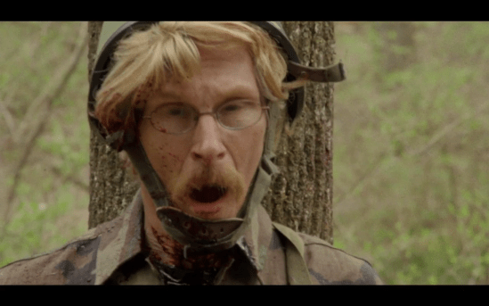 Capes writes for himself as the hard-up paleontologist Dr. Grant Walker, a play on Sam Neill’s Dr. Allen Grant, who has succumb to being of caricature of his profession and while the Dr. Walker is downcast despite his credentials, educations, and reputation, opposite him is the town goof Deniel “Denny” Denielson (David Shackelford, “Beneath”), a friendless, family-less, theme park security guard who’s repute amongst his peer is lower than fossilized dinosaur crap, but his attitude remains cheerful and positive. The two characters complement each other with budding growth in their arcs of Dr. Walker not pushing people away like he did with ex-girlfriend Amber (Caitlin McHugh) and Denny, with every ounce of his hillbilly being, trying to a fault to make a friend. There’s a slew of eccentric side characters but one not more as colorful as chicken farmer Henrietta McClusky. Played by the early 70-year-old Sandy Martin, the “Scalpel” role debuting actress who had a profound supporting character career having had a role in “Napolean Dynamite” and “Three Billboards Outside Ebbing, Missouri” in recent years continues her dry humor, dark comedy run with the Henrietta role a crude, rude, and with ton of attitude poultry farmer with a no nonsense way about her and while Henrietta is a deeply sexual creature in her own right, the amorous tension lies in between Walker and Amber that have instantly become two magnets in rekindling their lost flame. The ease of which the two characters are written to be instantly smitten is greatly construction to be an almost an unattainable relationship by introducing a child with no relationship to either one of them, a decade long gap without a ton of hurt feelings for the other’s sudden decision of career over love, and, the obvious, a large, man-eating, invisible predator repelling the two magnets apart. Sprinkled with familiar faces, “The Invisible Raptor” rounds out with notable cult film actors, such as Richard Riehle (“Office Space,” “Hatchet”), Larry Hankin (“Armed and Dangerous,” “Home Alone”), and Sean Astin (“Encino Man,” “Lord of the Rings”) as well as a cameo appearance from Vanessa Chester who played Dr. Ian Malcolm’s daughter in “The Lost World” in another potshot at the “Jurassic Park” series.