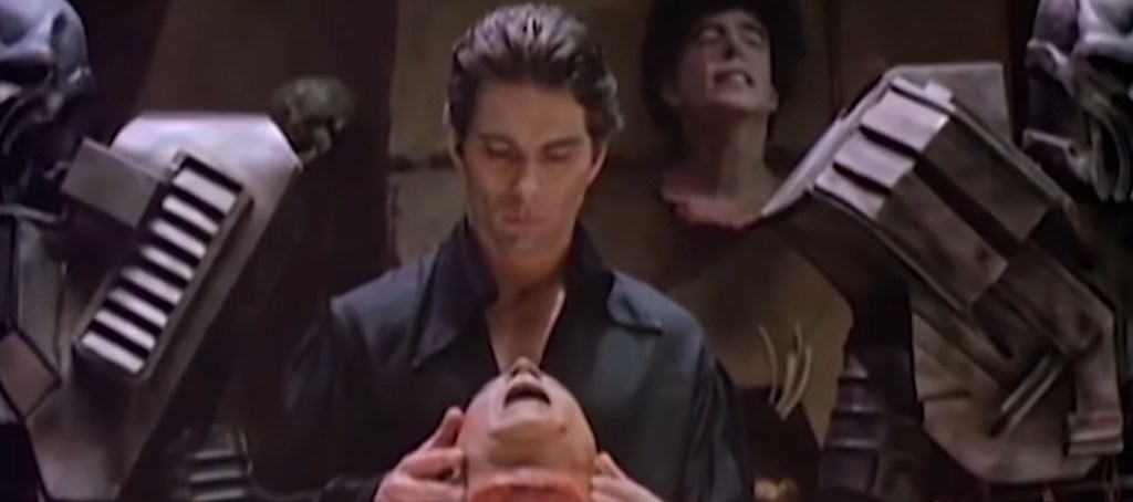 With the title like “Slave Girls from Beyond Infinity,” there better be a skimpy garbed cast of gorgeous women pew-pewing with futuristic laser guns and using their sexual promiscuity as a dangerous weapon. Fortunately for us, Ken Dixon doesn’t drop the ball fulfilling the fantasy or, how I see it, is necessary for such a midnight showing title. The film follows the imprisonment, escape, and into the hands of a human hunting madman story of Daria and Tisa, played by the super fit, super sexy blondes Elizabeth Kaitan (“Necromancer,” “Friday the 13th: The New Blood”) and Cindy Beal (“My Chauffeur”). Kaitan edges out Beal as the lead set early with Daria’s relentless confidence and better adept at taking advantage of a situation but both women play into the strong female heroine as they knock out well-armed and body-armored male guards, intoxicate the male, and even to the implied extent of a male identifying robot, gaze, and take on the murderous Zed in his own devious game albeit both barely having any clothes on for most of the duration in the cold of space and in the heat of the jungle. Kaitan and Beal are not the only bodacious bods in the cast with the 80’s household scream queen Brinke Stevens (“The Slumber Party Massacre,” “Sole Survivor”) puts a foot out of the girl in a shower and other unnamed nude girl role and into a more principal character with Shala, a fellow planet stranded survivor from a previous crash told anecdotally, and in an opening, nonspeaking minor role, but definitely bursting with screams, and at the seams, of a barely covered flesh, is the unknown beauty Sheila White. Stevens is sister to whom would become the “The Dark Half’s” special and visual effects supervisor, Carl Horner, as he plays Rik, a handsome, young man with a sneaking suspicion about their too-gracious of a host and a toying, on-the-brink love interest to a firm and more confident Daria in a steamy show sex scene to throw Zed off their conniving scent toward his do-no-good plans. Zed’s a hard card to turn over and understand his true nature. Played with impeccably classy and sporting glittery adorned, gun metal leather like a Niel Diamond on-stage outfit, Don Scibner has a traditional charm about him that he’s carried with him from his debut role in this Dixon film to other B-pictures laced with cult impression, such as “Moon of Scorpio,” “Night Shade,” and “Witchcraft XI: Sisters in Blood,” and really sells it as a game hunter giddy with the opportunity for new blood to track – male and female. Between starship guards, robots, and planetoid mutants, Kirk Graves, Randolph Roehbling, Bud Graves, Jeffery Blanchard, Fred Tate, Jacques Schardo, Mike Cooper, and Gregory Lee Cooper fill in the supporting role gaps.