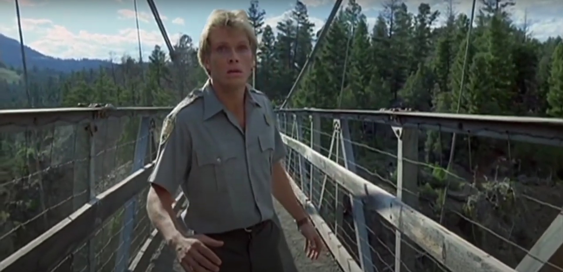 What’s interesting and more infrequent for this Italian production is that it’s entirely shot in English and not dubbed in post-production ADR.  Reason for this was for “Nothing Underneath” to be a synch-sound production with the image and to market it better internationally because of the main cast comprised of American and English actors.  The American actor, starring in his debut feature film, is Tom Schanley (“Savage”) as Wyomning park ranger Bob Crane and the way the story is structure really homes in Crane as the principal lead with a complete credit setup and character follow-through of the Yellowstone National Park.  Schanley’s blonde hair and muscular toned good looks embodies a likeness to his on-screen supermodel sister, played by Nicola Perring, who, as the story displays her, is not in the business of acting with very little dialogue and is only used for her short platinum blonde hair and thin figure for narrative form fitting.   The other native English speaker in a cooperative lead role is “Halloween’s” Donald Pleasence as an investigator on the verge of retirement.  Pleasence is no stranger to Italian cinema, seeing his fair share in the 1980’s psychotronic pictures, including Dario Argento’s “Phenomena” released prior.  The prolific British actor still manages to produce mountains of charm even in his most rubbish Italian accent as the long in the tooth comminssario eager to solve one more exciting, mysterious case and buddying up with young, handsome, and outdoorsy Bob Crane with twintuition.   The love interest falls upon real life model and Denmark native, then 19-year-old Renée Simonsen who is absolutely stunning with her looks and with her debut into acting in what is a significant role that involves a lot of screentime, a lot of dynamic and interactive dialogue, and does show some brief nudity with intimate sexual situations with Schanley.  “Nothing Underneath” has a roster that fills out with Catherine Noyes and Maria McDonald as Milan models, Paolo Tomei as a coke-head jeweler and model philanderer, Cyrus Elias as Comminssario’s Danesi’s assistant, and Phillip Wong as the peculiar fashion photographer Keno Masayuki.