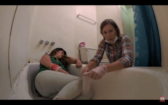 Rina’s unceasing eating disorder has staked a claim as one of the spurs affecting Carly and Rina’s declining relationship and, yet, when another eating disorder where mankind craves the taste of each other, the once quarreling lovers reignite the warmth that was once their bond in an amusing parallel of events. Character analogies are not the only nice touches provided by Souder who tweaks the zombie, extending upon George Romero’s evolutionary concept of a learning and pliant zombie while also creating a big world apocalyptic problem with small world capabilities, with the undead playing possum – how very “Resident Evil.” The 74 minute runtime offers ideal pace to not linger in exposition, which some horror love stories tend to do, balancing the backstory and the instantaneous chaos into a smooth transition of events. The camera POV style renders the same objective with also a bit of tranquility that’s like a calm before the storm rather, as some ambience is muted by security cameras. The effect results a frightening, breath holding silence which is a nice, eerie touch of cinematography and uncluttered audio.