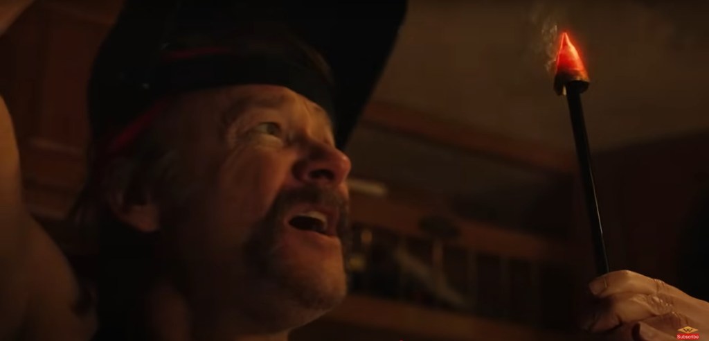 Capes writes for himself as the hard-up paleontologist Dr. Grant Walker, a play on Sam Neill’s Dr. Allen Grant, who has succumb to being of caricature of his profession and while the Dr. Walker is downcast despite his credentials, educations, and reputation, opposite him is the town goof Deniel “Denny” Denielson (David Shackelford, “Beneath”), a friendless, family-less, theme park security guard who’s repute amongst his peer is lower than fossilized dinosaur crap, but his attitude remains cheerful and positive.  The two characters complement each other with budding growth in their arcs of Dr. Walker not pushing people away like he did with ex-girlfriend Amber (Caitlin McHugh) and Denny, with every ounce of his hillbilly being, trying to a fault to make a friend.  There’s a slew of eccentric side characters but one not more as colorful as chicken farmer Henrietta McClusky.  Played by the early 70-year-old Sandy Martin, the “Scalpel” role debuting actress who had a profound supporting character career having had a role in “Napolean Dynamite” and “Three Billboards Outside Ebbing, Missouri” in recent years continues her dry humor, dark comedy run with the Henrietta role a crude, rude, and with ton of attitude poultry farmer with a no nonsense way about her and while Henrietta is a deeply sexual creature in her own right, the amorous tension lies in between Walker and Amber that have instantly become two magnets in rekindling their lost flame.  The ease of which the two characters are written to be instantly smitten is greatly construction to be an almost an unattainable relationship by introducing a child with no relationship to either one of them, a decade long gap without a ton of hurt feelings for the other’s sudden decision of career over love, and, the obvious, a large, man-eating, invisible predator repelling the two magnets apart.  Sprinkled with familiar faces, “The Invisible Raptor” rounds out with notable cult film actors, such as Richard Riehle (“Office Space,” “Hatchet”), Larry Hankin (“Armed and Dangerous,” “Home Alone”), and Sean Astin (“Encino Man,” “Lord of the Rings”) as well as a cameo appearance from Vanessa Chester who played Dr. Ian Malcolm’s daughter in “The Lost World” in another potshot at the “Jurassic Park” series.