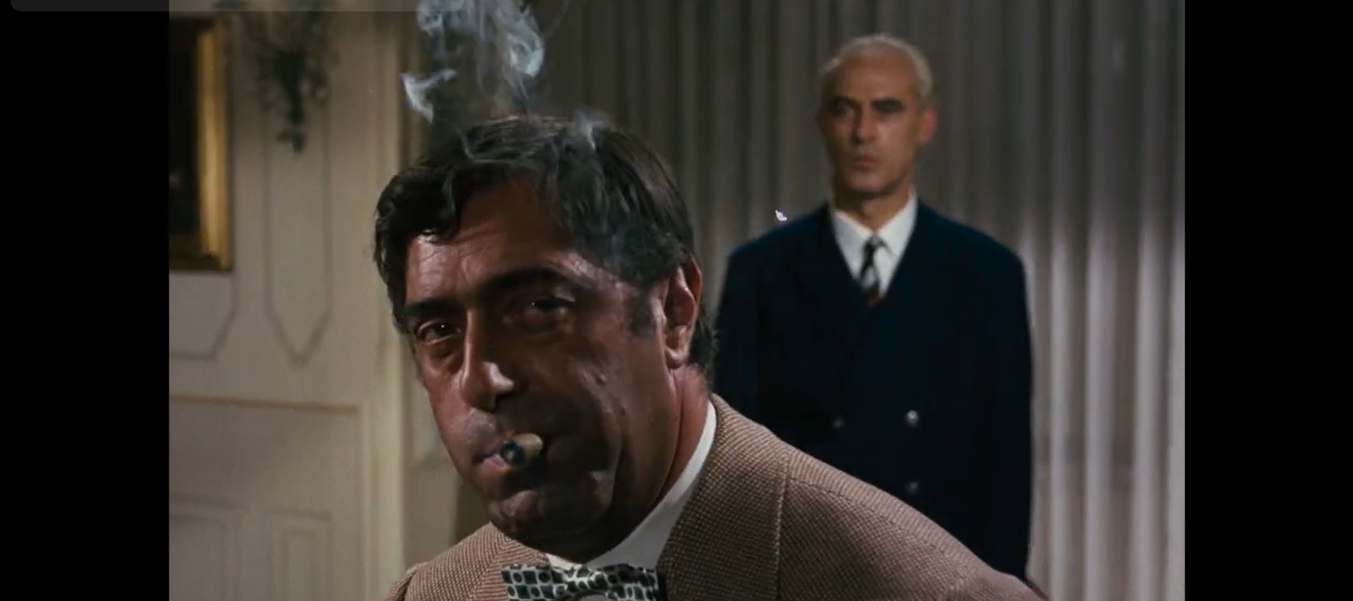 What’s interesting about “A Hyena in the Safe” is the beginning of the story plotted at the act of reassembling the team and only provide expositional context to a heist well after it’s been done, eleven months ago in fact. All the characters are fresh and unknown to the audiences, we don’t know their personalities, their skills, their habits, or their attitudes toward one another, and all that dynamical odds and ends has processed, forcing those new to the film to watch, listen, and learn their way through the personality types and the situation at hand. The tension is quickly laid out amongst the already side-eying and suspicious group of sophisticated thieves that react no differently from the lower class of thief with same cutthroat intent. Keeping up with Canevari’s edited pacing and unconventional angle shots that squeeze out the tension with taut framing on expression-filled cutting of eyes and fear-induced faces, the mounting intriguing factors wet story hungry appetites with playful catering of the imagery that also consists of fixed and tracking shots. Considering the film’s more conservative decade, Canevari builds tasteful implied sexual acts between conniving characters and is only explicitly, in physical means, when the scene calls for it, leaving gratuitousness begging to be let in. One aspect with the pacing that hurts the enticingly heightening pressure cooker between the first act’s slow trot through choppy seas of character dynamics to elucidate taciturn behaviors and backdoor alliances and the last act’s spit firing and cutdown of those who are left standing, there is seemingly no middle act to funnel the trepidation and mystery from one end to the other in an abrupt ease into a quickly diminishing situation that goes from murder mystery to battle royale with switchblade umbrellas, electrifying door handles, and an indoor garage that can turn into an asphyxiating fish tank in a matter of minutes. There’s an early James Bond campiness to the story’s temperament that can’t be ignored while be positively and simultaneously interesting.
