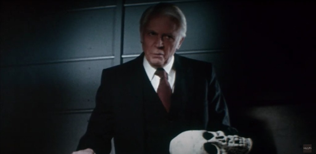 Now, “Season of the Witch” just didn’t star a bunch of nobodies in this offshoot of a newly branded “Halloween” concept.  Before playing the quasi-alcoholic, deadbeat father Dr. Challis, Tom Atkins was already a rising star in the land of John Carpenter films with “The Fog” and “Escape from New York” In 1980 and 1981.  Atkins’s usual confident and charming qualities underneath the rugged good looks and trimmed mustache serve him the better part of man doing his bit part in a not-his-business investigation of a man’s death to please a good-looking woman that happens to be the dead man’s daughter.  That good-looking woman is Ellie Grimbridge, embodied by the Mad Magazine Production’s “Up the Academy’s” Stacey Nelkin, and if you blink, you might miss Atkin’s Dr. Challis being perhaps the worst father ever to his two children and ex-wife.  The subplot is so subtle and overshadowed by the Silver Shamrock Halloween plot that being invested in the crumbling family dynamics doesn’t even hold substantial weight and it truly works to subvert the subconscious and plant a destructive pipe bomb smartly into your moral compass because if you think Dr. Challis is the hero of the story, which in many perspectives he is, he’s also doesn’t keep up with his own children interests or current events, numerously bails on their planned care, runs off and sleeps with a much younger woman he hardly knows, is an active alcoholic, and is quite the handsy philanderer at that when he grabs his much older nurse’s bottom in a playful moment.  No, Dr. Challis is every ounce an antihero hidden in plain sight and in the guise of a potential savior of the children, the world, as he takes on Silver Shamrock and its founder, an Irish toymaker named Conal Cochran with tremendous evil genius and mastermind appeal by Dan O’Herlihy (“The Last Starfighter”).  “Halloween III:  Season of the Witch” rounds out the cast with Ralph Strait, Jadeen Barbor, Al Berry, Michael Currie, Garn Stephens and Essex Smith in key support roles.