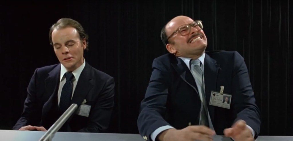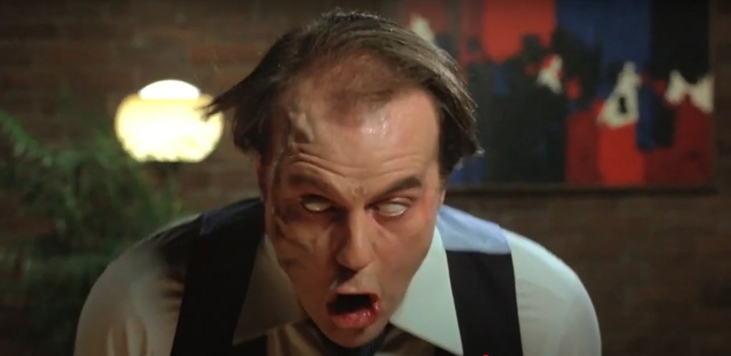 To follow up “The Brood” almost right on its heels with “Scanners,” David Cronenberg’s creative synapses were just thunder stroking on all cylinders with ways to evolve mankind into next level grimdark science fiction.  The simple premise of the advanced human condition sparking a potential war between normal man and Scanner man with a private weapons developer in the middle, perhaps inadvertently or intentionally coaxing a new breed of man, is elevated by the special effects of Gary Zeller (“Visiting Hours, “Amityville II: The Possession”) and the makeup alley-oop by Dick Smith (“The Exorcist”) to give audiences those head-exploding, vein-popping, fire-starting special effects that are sear so well into the mind they’re virtually unerasable from the mind, as if real life scanners were implementing the reel into the occipital lobes themselves.  Plot devices like these inarguably saturate the cloak-and-dagger, on-the-run, and species-eradicating storyline with leadup anticipation, building suspense through the truth and lies of Vale’s assignment as well as Vale understanding and, ultimately, accepting his gift rather than seeing it as a burden or a blight to his being.  Unlike “The Brood,” “Scanners” leans more into the physical method of effects with not only the pulsing veins and the white contact lenses but Cronenberg amps up the pyrotechnics with violent and fiery explosions, both of which do a number of the body with blunt invisible force ravaging soft tissue, and also sets ablaze characters’ specific, isolated areas for visual awe and a presentation of a whole new possibility dimension plane of the mind and body that can create, endure, and eventually destroy.