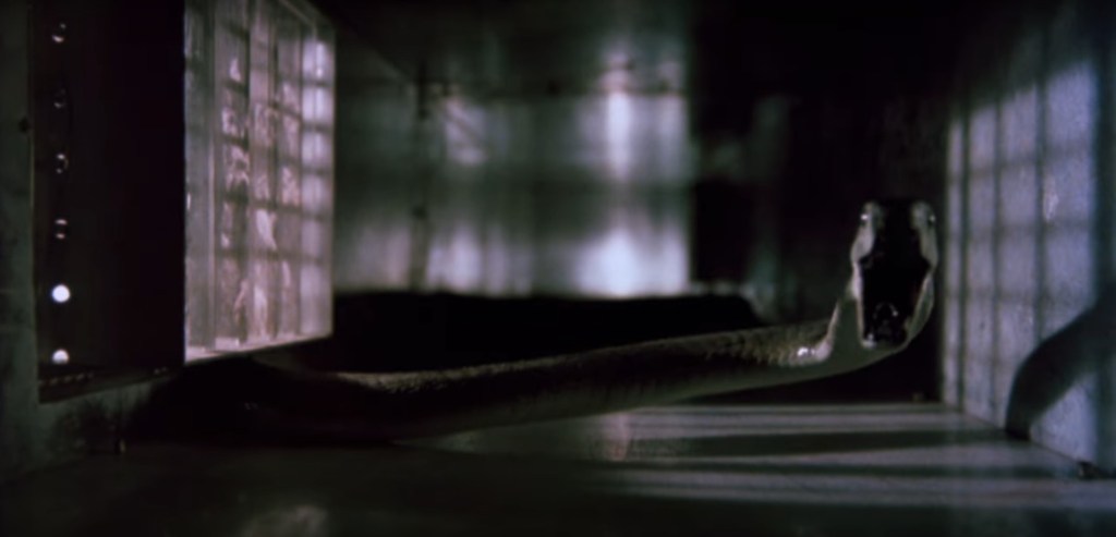 From the pages of Alan Scholefield’s novel to the big screen, “Venom” has a slithery way about slipping into between the crosshairs of a crime-thriller and a venomous creature feature. Leading “Venom’s” charge is an undoubtedly great, if not iconic, cast giving their all to a farfetched plot of bad luck Ophidiophobia. While the snake seems to have heat vision eyes only for the Klaus Kinski, Oliver Reed, and Susan George trio of kidnap-for-ransom criminals, who amongst themselves are in a deceitful love triangle that’s doesn’t quite come to a head as one would expect, there’s no animal kingdom peril to the other victimized threesome who, on a physical, first glance surface, are less equipped to handle a dangerous snake with a young, asthmatic-plagued boy, an elderly grandfather, and a nerve-bitten woman but, in reality, Phillip Hopkins, Howard Anderson, and Dr. Marion Stowe are respectively the best equipped to handle the black mamba as an small animal atrium hobbyist, a former African safari survivalist and animal expert, and a venomous snake toxicologist. Perhaps, this is why the Black Mamba avoids these three at all costs and never interacts with them on a perilous level. The fantastical mist that’s sprays us lightly with a crimefighting snake has comical properties that standout against what is a palpable thriller involving an international criminal, cop killing, child abduction, and the mutilation of a corpse.
